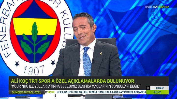 09月18日讯 费内巴切俱乐部主席阿里-科奇最近作客土耳其TRT体育节目,谈到了穆里尼奥遭本菲卡淘汰出欧冠后,被费内巴切解雇转而执教本菲卡的话题。